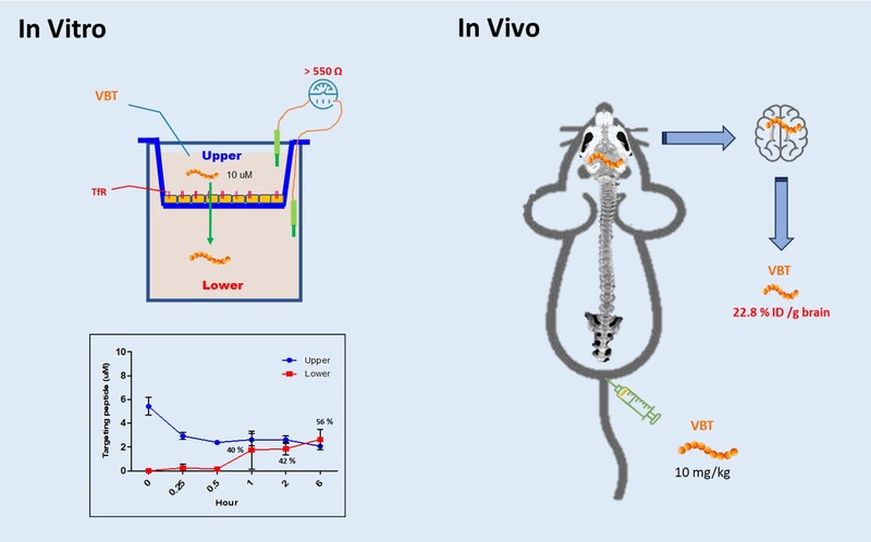體外培養緻密的單層細胞模擬 BBB,水的電阻值大於 550 Ω,在這個環境物質是不能任意通過。將 VBT 靶向胜肽置入上層,量測下層的 VBT 靶向胜肽, 它可以穿透模擬緊密的 BBB ,達到超過 40 % 之穿透量,並在 1 小時達到上下層濃度平衡。或將 VBT 靶向肽打入小鼠體內,在一小時後分析腦部的 VBT 靶向胜肽的含量,每克大腦中檢測到超過 20% 注射劑量的 VBT 靶向胜肽。