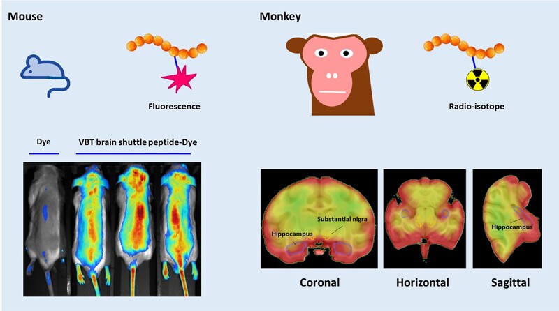 螢光染料標記之 VBT 靶向胜肽,打入小鼠體內,在不同時間觀察,其 VBT 靶向胜肽可聚集在小鼠的腦和脊髓區域。以放射線標記之 VBT 靶向胜肽,以靜脈注射於猴子身上,可以在極短時間內在發現它存在於腦部,極高的腦部含量及 10 -15 % 的腦血比值,而在特定疾病關注的區域,特別是在海馬迴 (阿茲海默症) 和黑質 (帕金森氏症) 的病變部位,也有很有極高的分佈。在猴子眼部的檢查中,眼球的生物分佈是最高的部分。