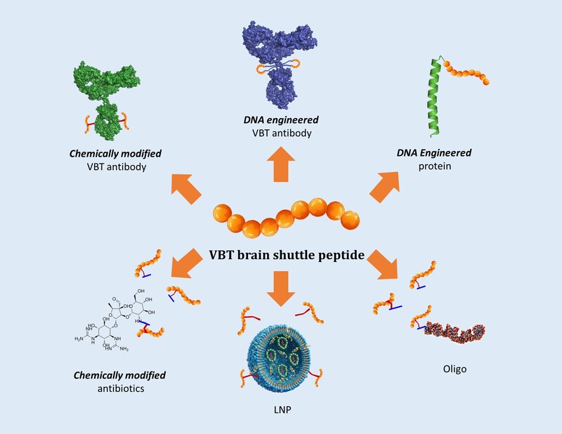 VBT 靶向胜肽可應用於不同藥物模式的 CNS 遞送,如生物製劑(抗體/胜肽藥)、小分子化學 (samll molecule therapeutic) 、短鏈 RNA(siRNA/miRNA)、脂質奈米顆粒 LNP(DNA/mRNA)和腺相關病毒 AAV (DNA/mRNA)等。